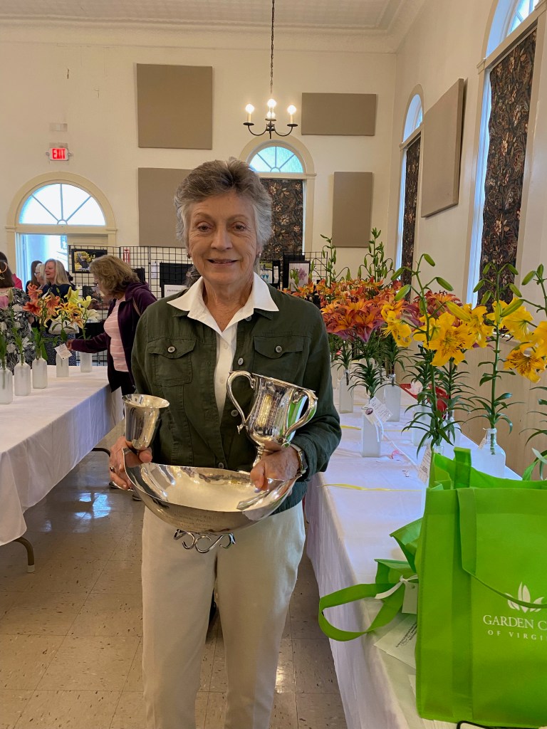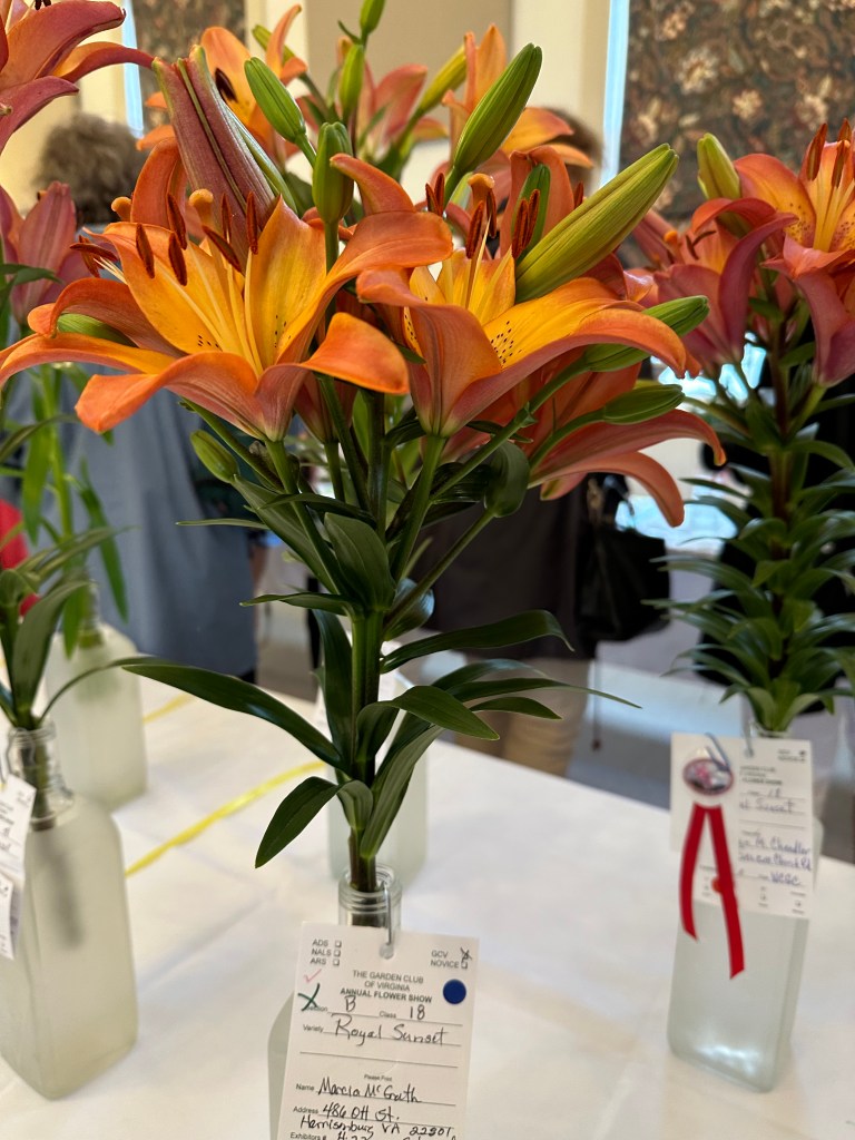 Glenna Graves walked away with 3 Silver Awards – The James A. McKenny Award for Best Longiflorum/Asiatic Hybrid Lily; The Gertrude Cody Minter Memorial Award for the Best Lily Stem in the Show; and The Sponsor’s Cup Award for the Best Asiatic Hybrid Lily. She won a total of 8 Blue Ribbons and 2 Red Ribbons.